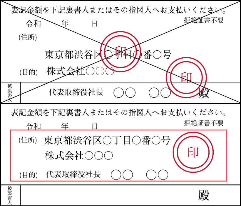 なお、法人・個人いずれの場合も「年月日」「被裏書人」「目的」の欄は必須ではないものの、可能であれば記入しましょう。